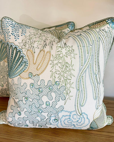 Embroidered Cowtan and Tout Seashells Coral Blue and green Designer Pillow Cover, Size 20” x 20”, Coastal Pillows, Throw Pillows